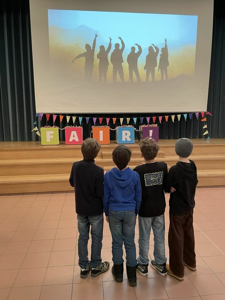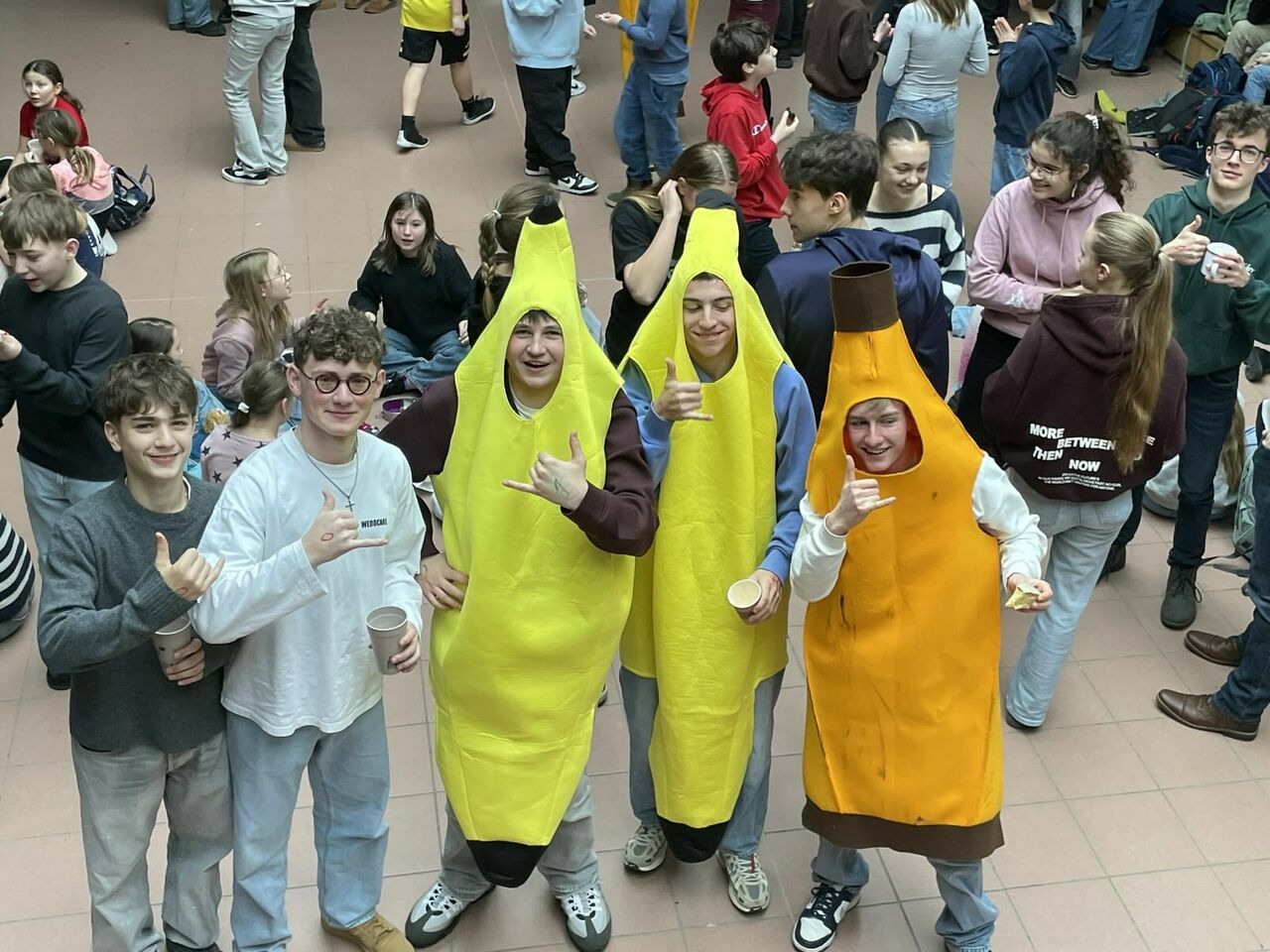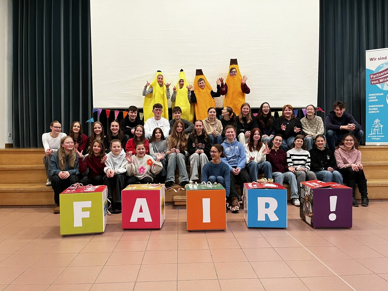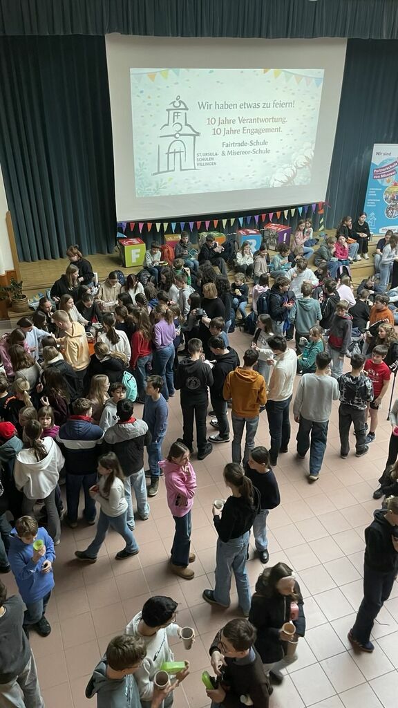 Die St. Ursula Schulen feiern ein Jahrzehnt des Engagements für mehr Gerechtigkeit, Nachhaltigkeit und globale Verantwortung!Schon am Morgen wurden alle in der geschmückten Aula begrüßt. Für gute Stimmung sorgten Musik, verkleidete „Bananen“, die fair gehandelte Bananenchips verteilten, sowie Schüler:innen des Weltladenteams. Als symbolische Erinnerung an diesen besonderen Tag erhielt jede und jeder einen Kugelschreiber mit der Aufschrift „10 Jahre Fairtrade-Schule, 10 Jahre Misereor-Partnerschule“, gesponsert von der Firma Schneider. Ein schönes Zeichen dafür, dass jede und jeder die Ideen von Fairness und Verantwortung weiterschreiben kann – heute und in Zukunft. 10 Jahre Einsatz für die eine Welt – für mehr Gerechtigkeit, Nachhaltigkeit und globale Verantwortung – das wurde an den St. Ursula Schulen mit allen gefeiert!
