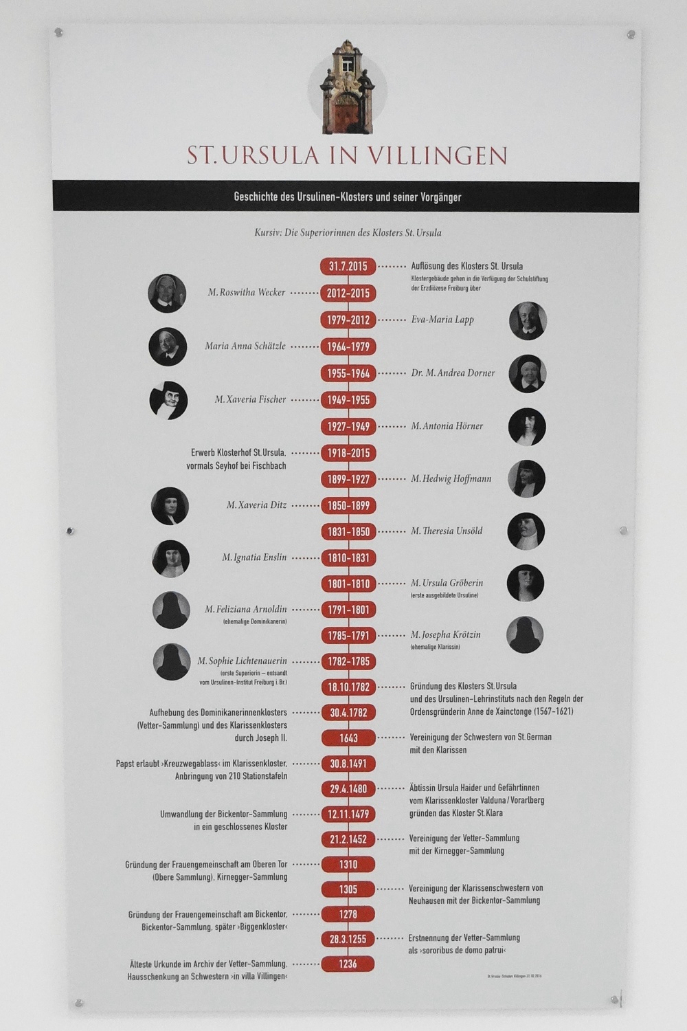 Am 20. Juli 2015 hat sich Sr. M. Siegrun Schachtner aus dem Konvent der Ursulinen von VS-Villingen verabschiedet. Mit der Auflösung des Klosters am Bickentor wird sie vom Konvent der Ursulinen in Brig im Schweizer Wallis aufgenommen, die nach derselben Ordensregel der Anne de Xainctonge leben und mit dem Villinger Kloster in einer Föderation verbunden sind. Bei ihrer Abfahrt nach Brig haben Schülerinnen und Schüler, Lehrerinnen und Lehrer der St. Ursula-Schulen sowie Mitarbeiterinnen des Klosters ihr zum Abschied aus den Fenstern gewinkt.Jahrhunderte alte Klostergeschichte endet