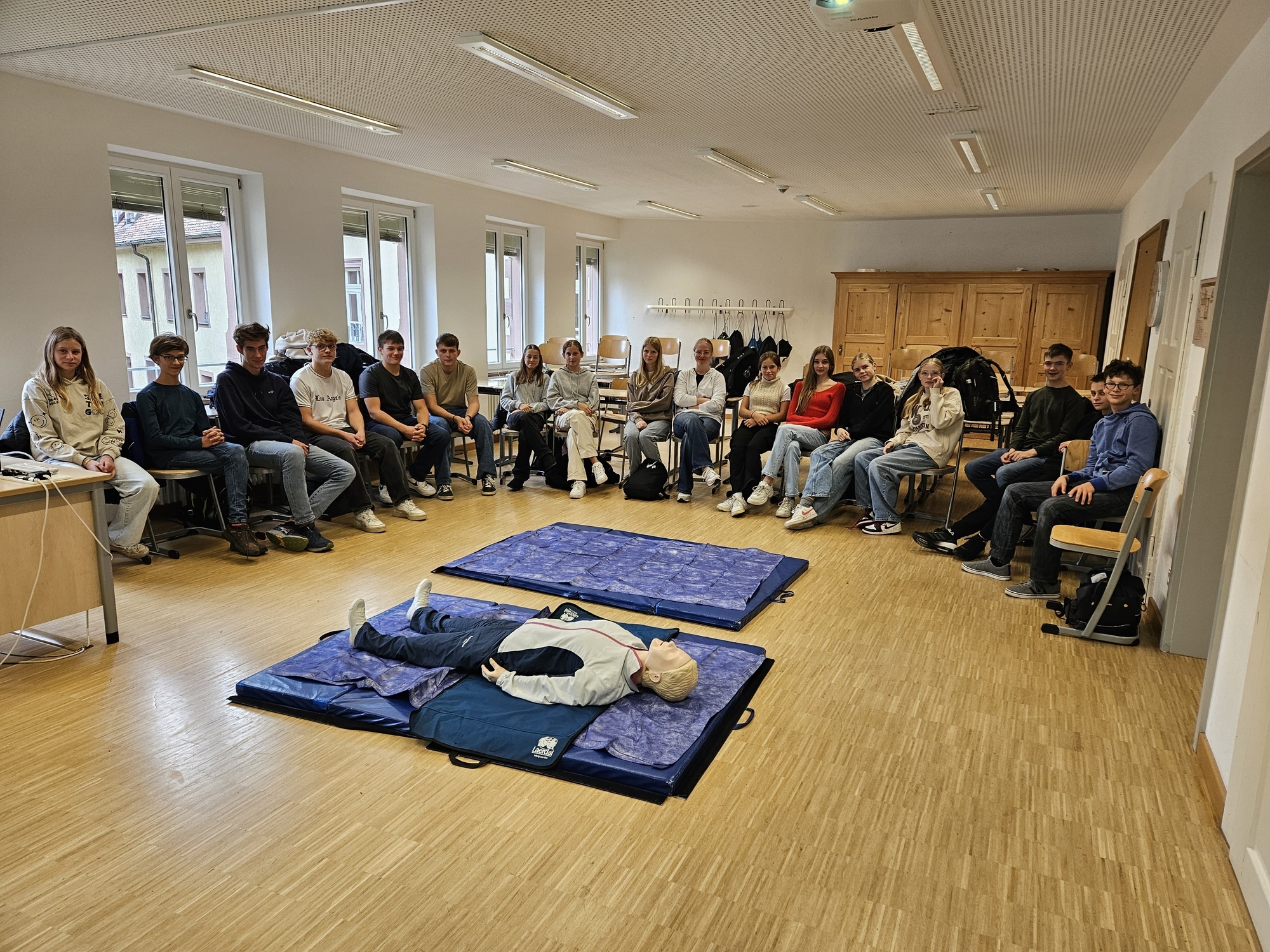 Die Schulsanitäter sind dieses Schuljahr wieder im Einsatz. Die AG hat 38 Mitglieder. Viele von ihnen sind schon seit ein paar Jahren tätig und leisten in der Schule Erste Hilfe.Am 9. und 11. Oktober 2024 fand der Erste-Hilfe-Kurs der Schulsanitäter statt. Viele neue und erfahrene AG-Mitglieder der 8. Klasse bis 10. Klasse wurden geschult. Die Malteser waren bei uns in der Schule vor Ort und gaben den Kursteilnehmern neben theoretischem Grundwissen auch viele praktische Hinweise mit auf den Weg. Alle waren motiviert und können als ausgebildete Helfer nun in der Schule ihr Können und Wissen anwenden.