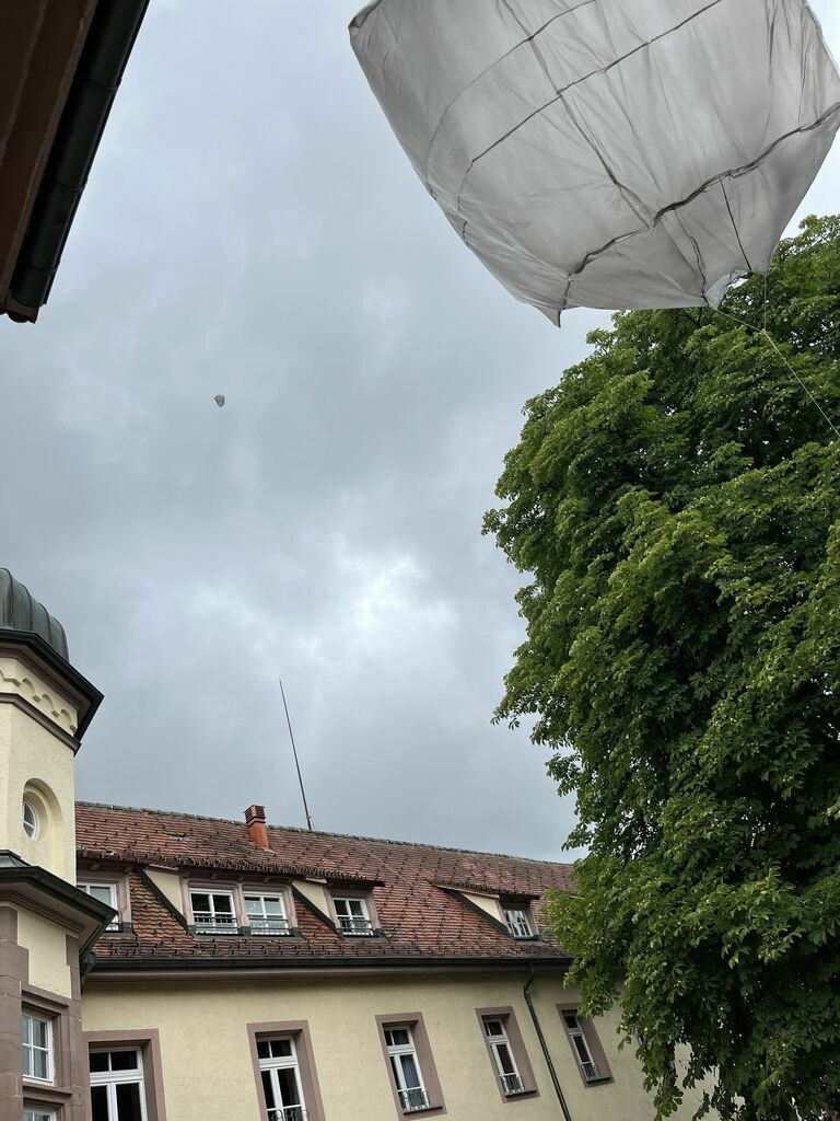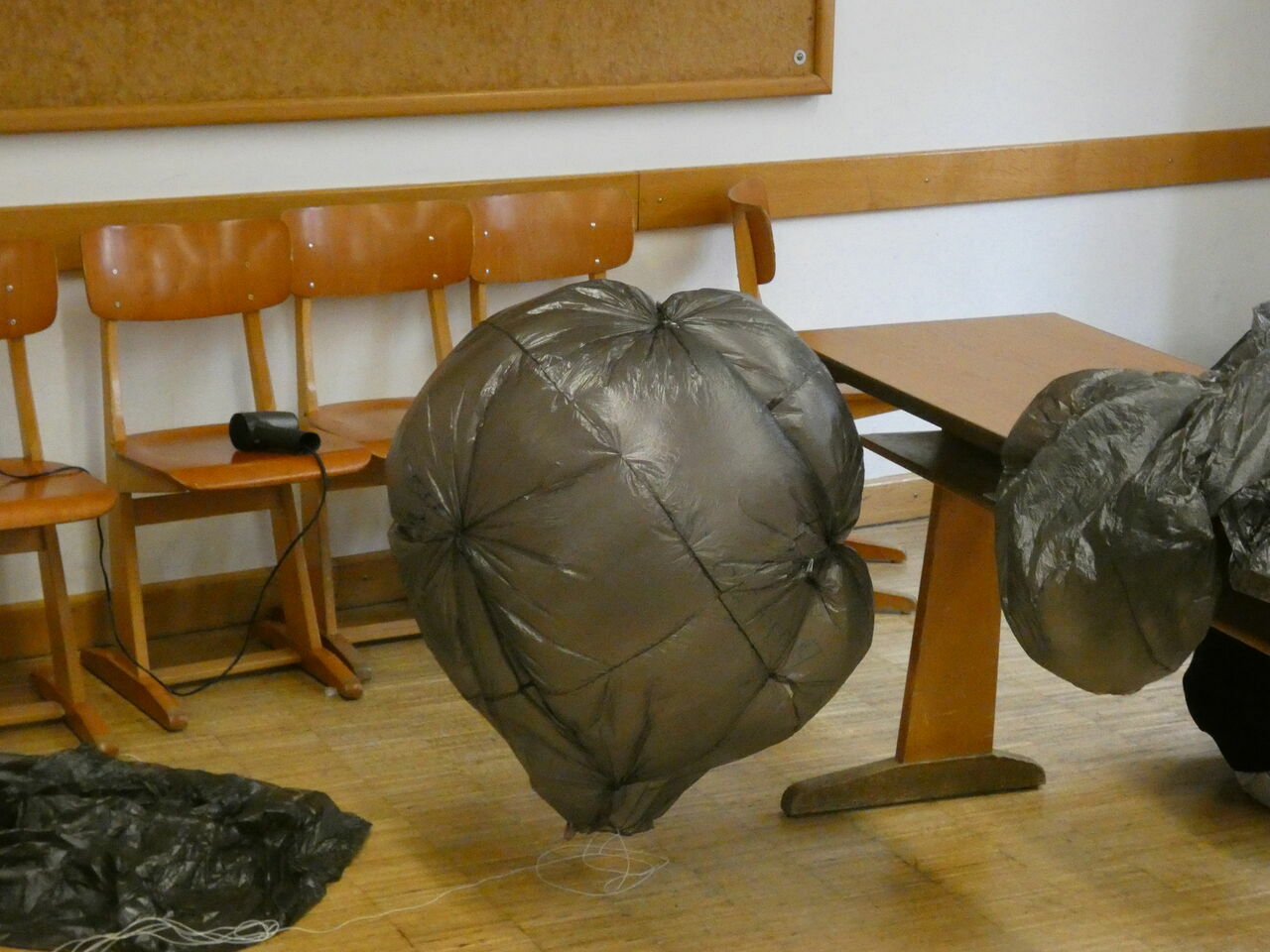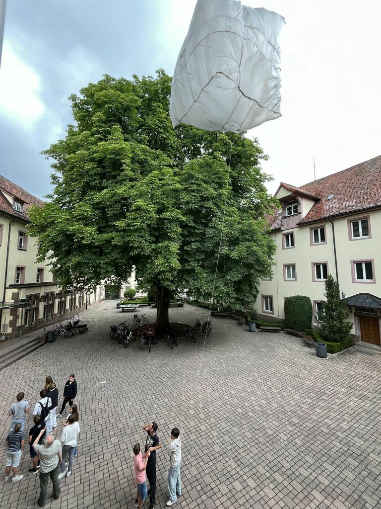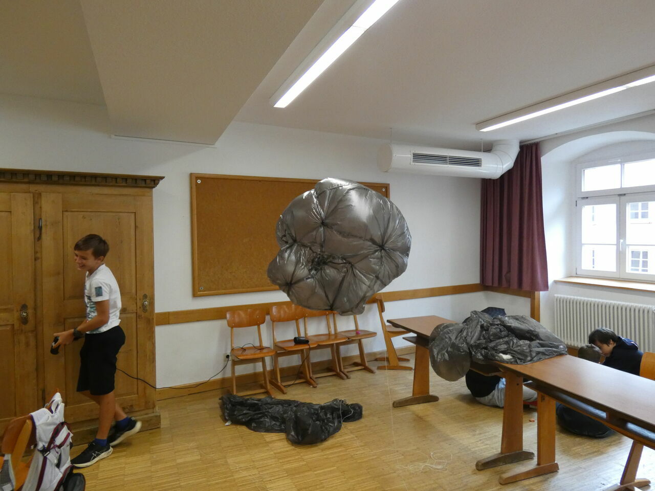 Bei dem Projekt mit Herrn Eschbach hatten die Teilnehmer die Möglichkeit, aus Mülltüten Heißluftballone zu bauen, die sich im Sonnenlicht aufwärmen und in der Luft schweben. Die Schüler hatten die Möglichkeit, verschiedene geometrische Formen auszuprobieren.